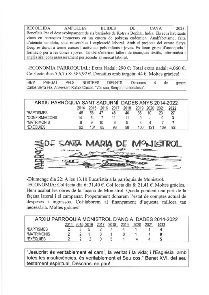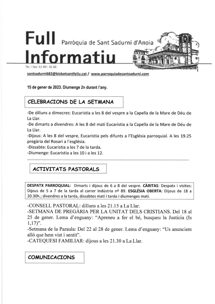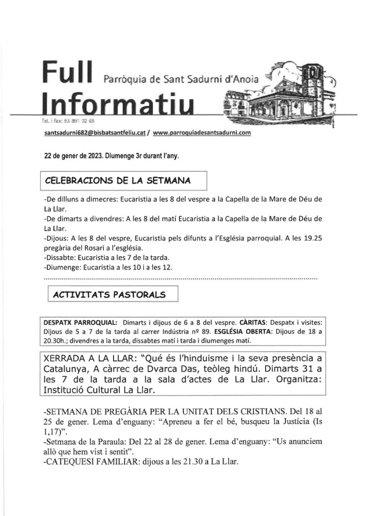FRASE DEL DIUMENGE, PREGÀRIA I FULL PARROQUIAL de Diumenge 31 de Desembre de 2023