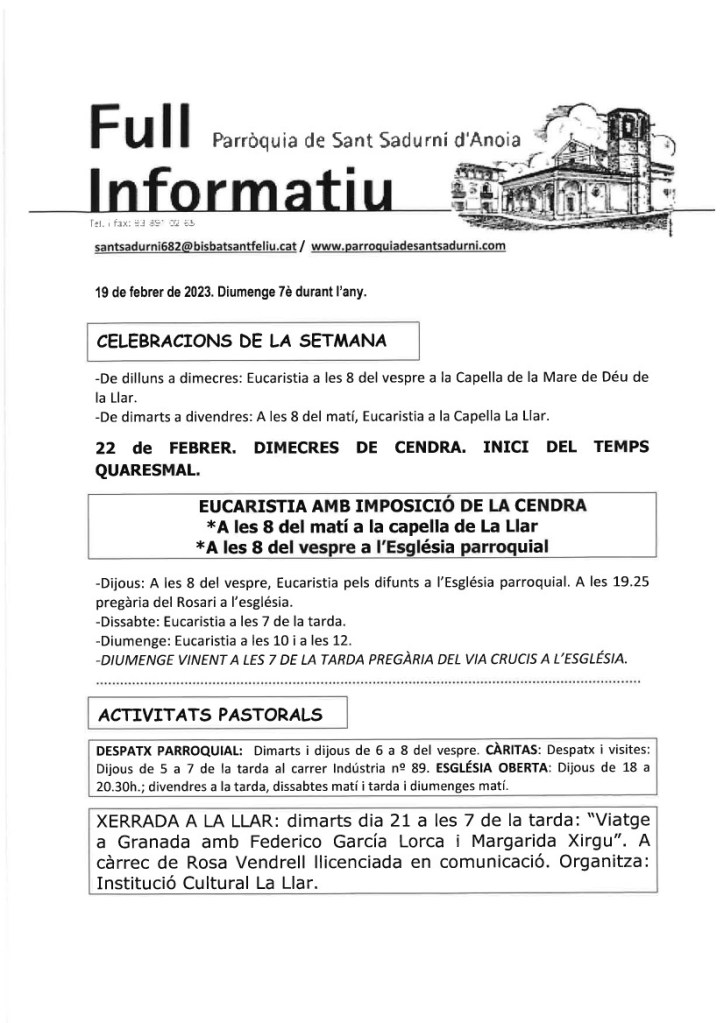 FRASE DEL DIUMENGE, PREGÀRIA I FULL PARROQUIAL de Diumenge 18 de Febrer de 2024