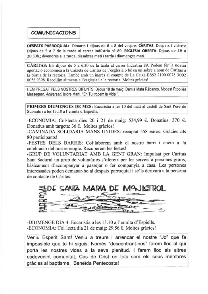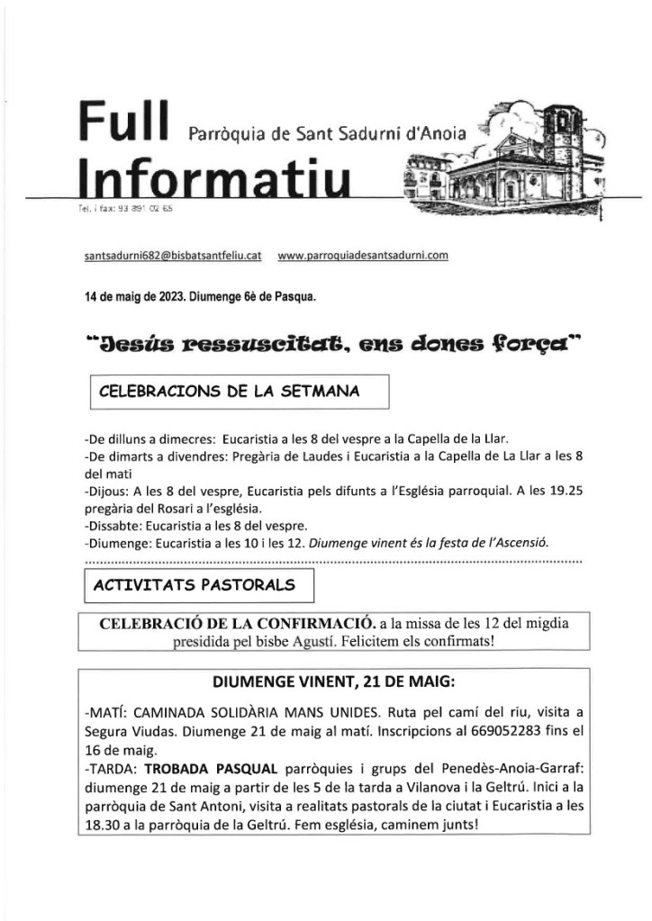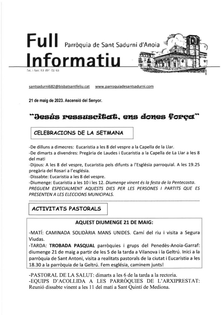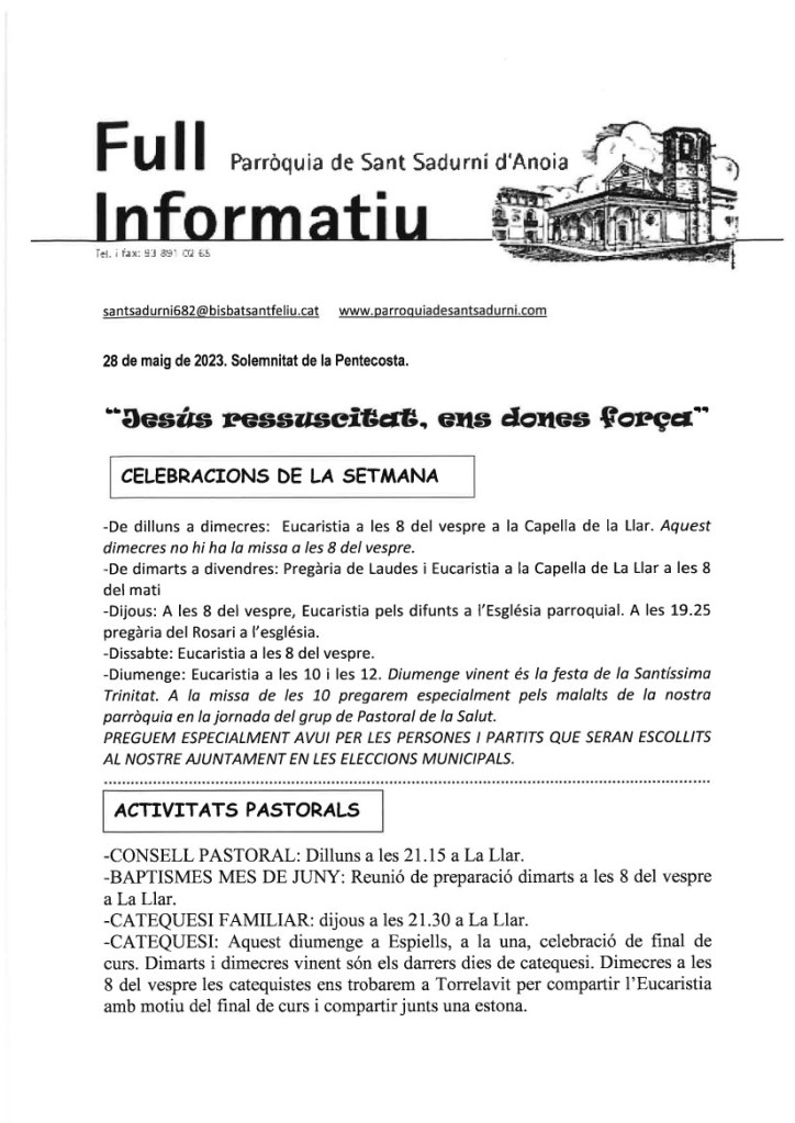 FRASE DEL DIUMENGE, PREGÀRIA I FULL PARROQUIAL de Diumenge 19 de maig de 2024