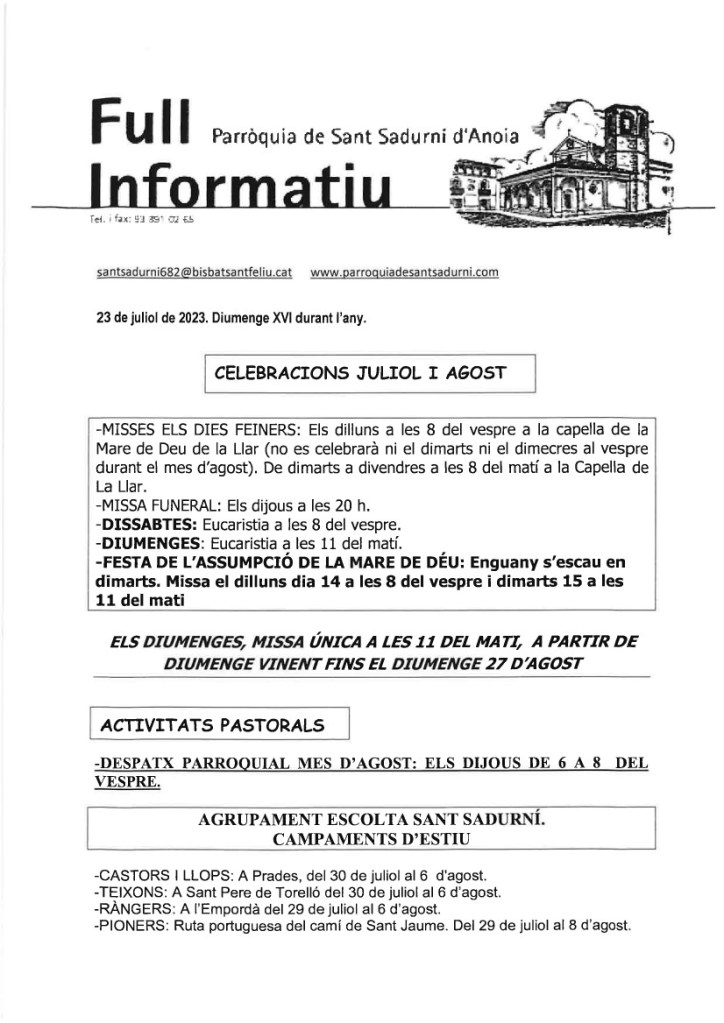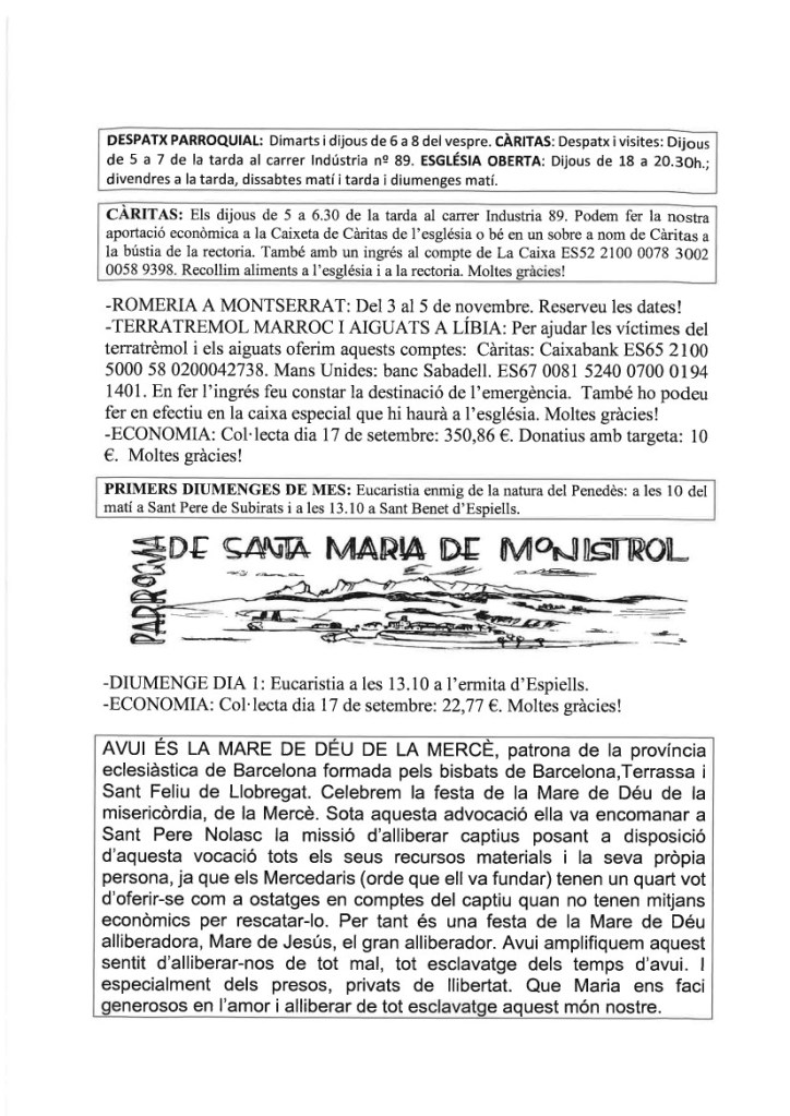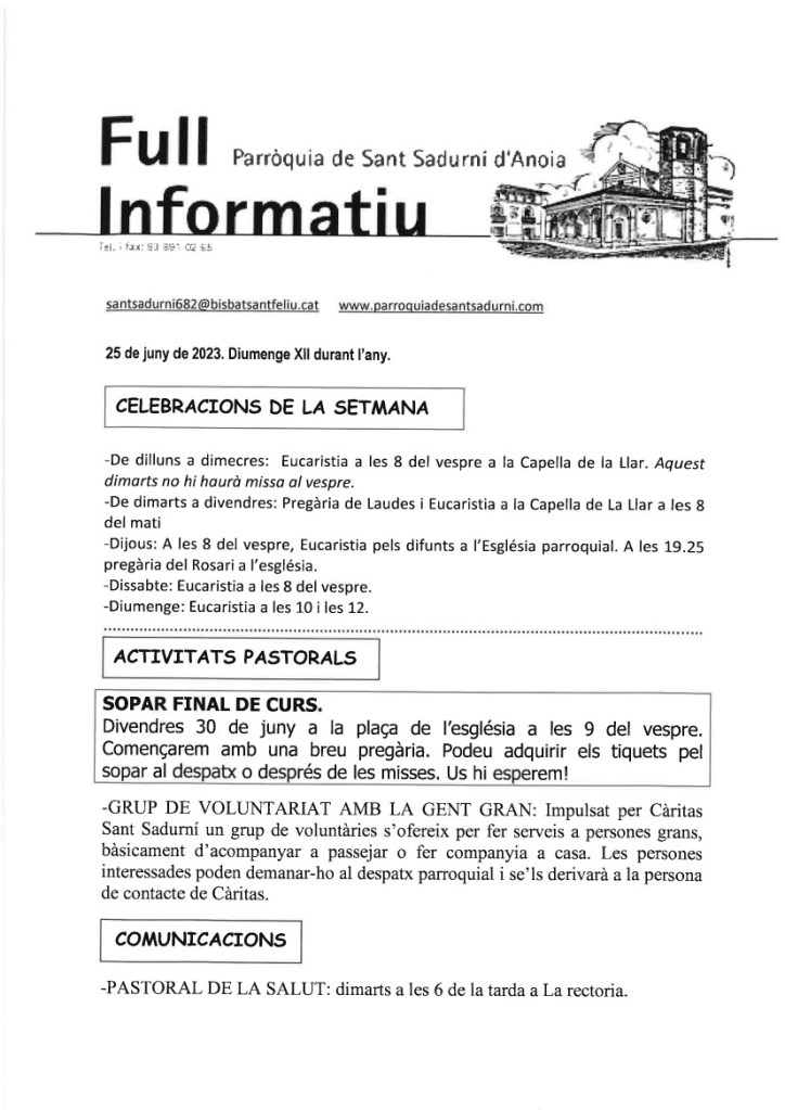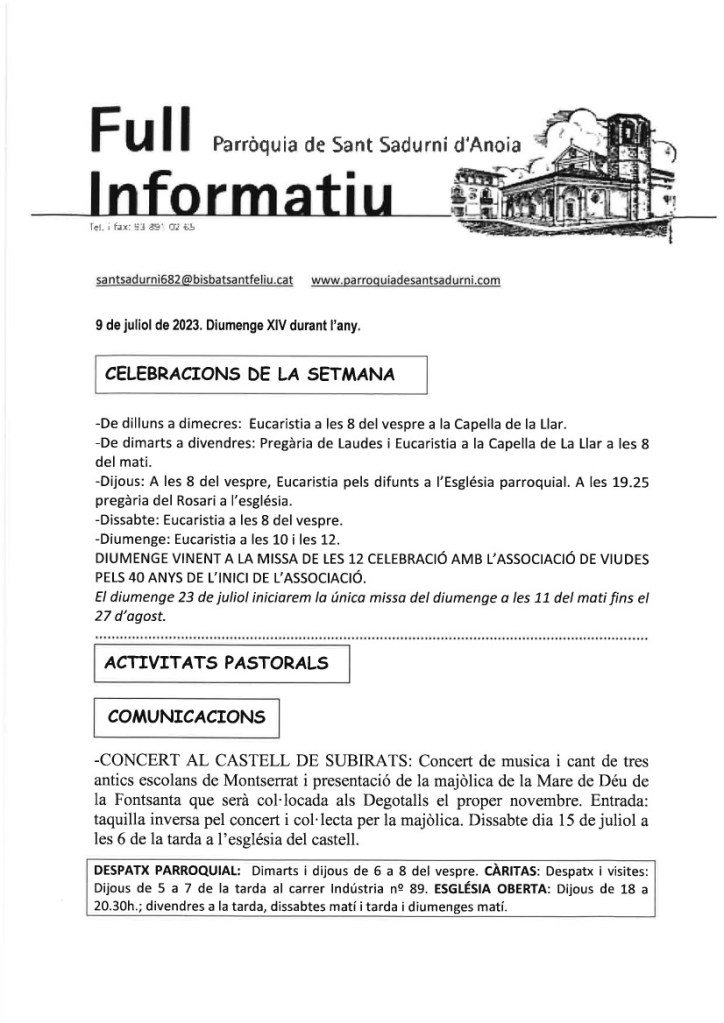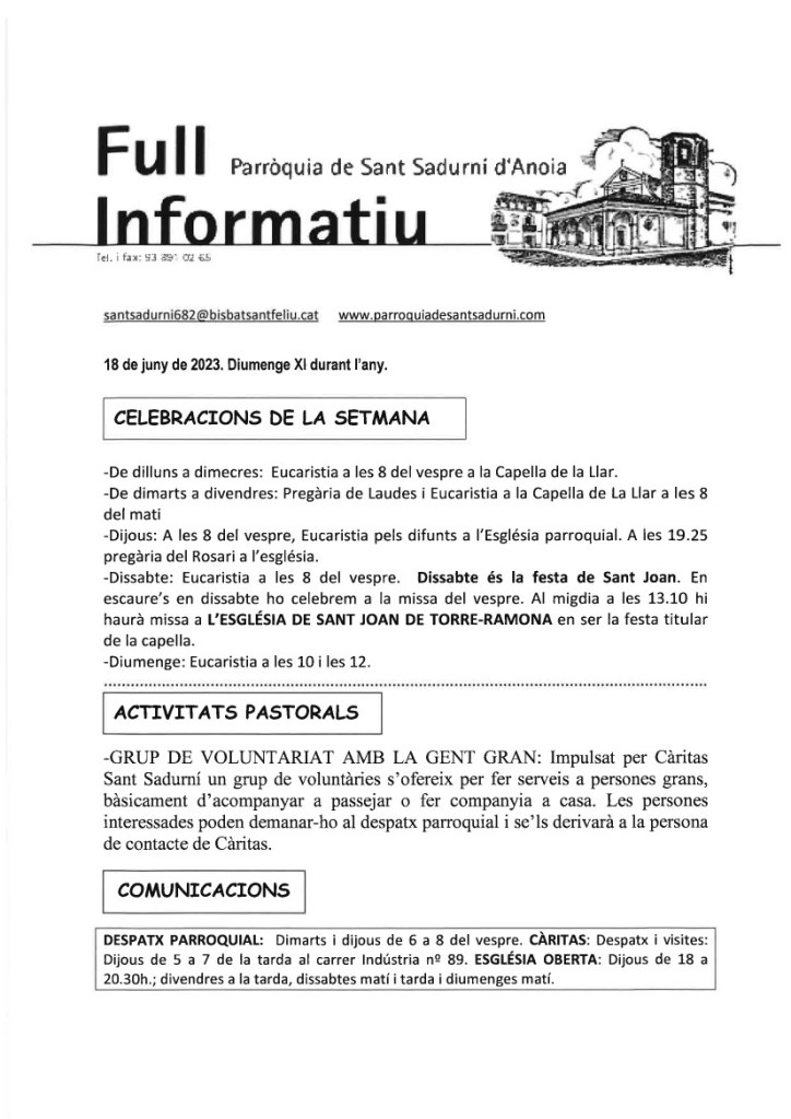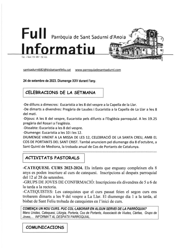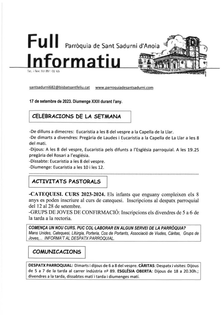 FRASE DEL DIUMENGE, PREGÀRIA I FULL PARROQUIAL de Diumenge 15 d’Octubre de 2023