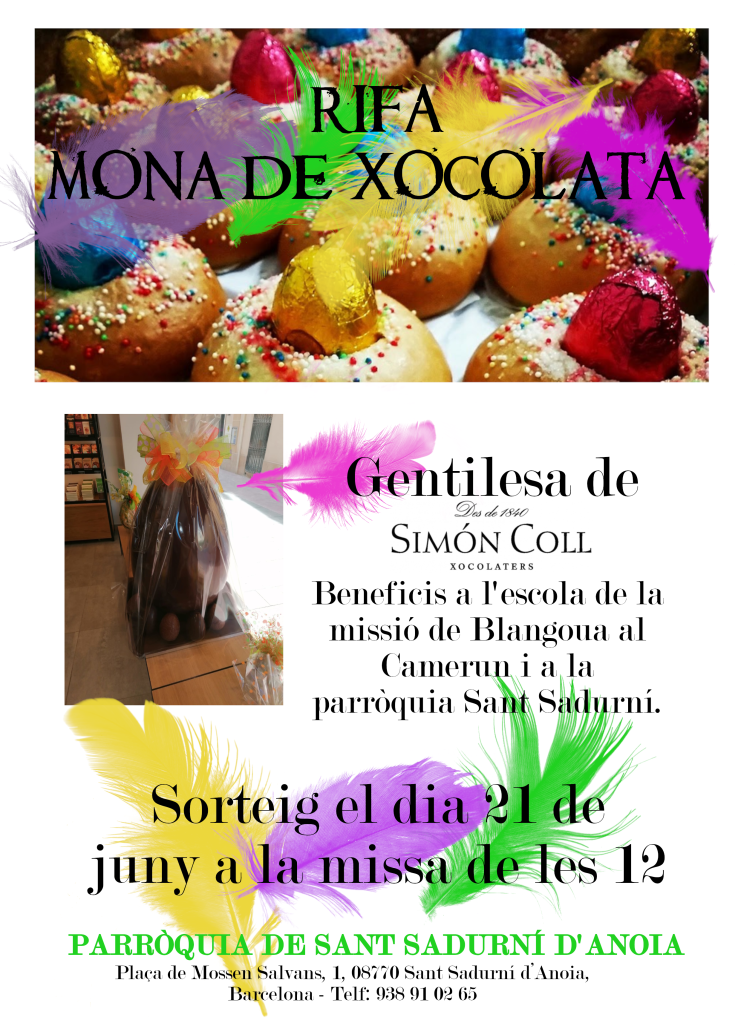 Gentilesa de Xocolates Simon. Pots comprar tires de la mona a les misses del cap de setmana o a Xocolata Simon. Pots fer uns transferència bancària posant el teu nom i telèfon i et direm els numeros que et guardem.
