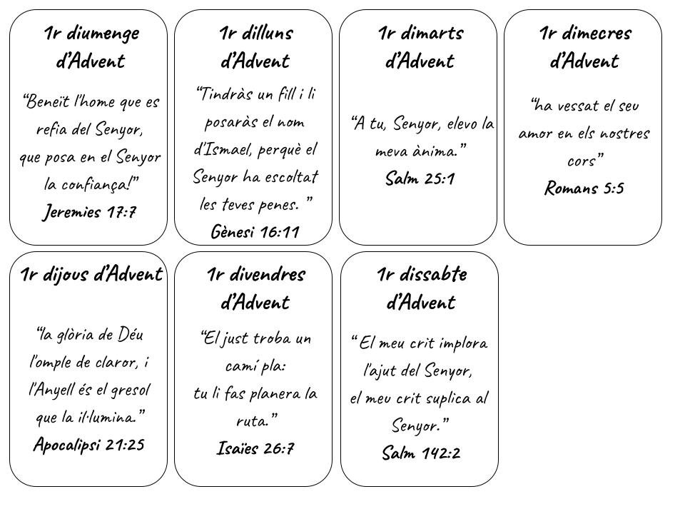 Una manera fàcil d’introduir-nos a les lectures d’Advent és tenir una targeta per cada dia amb un versicle central del fragment que toca. Podeu imprimir-les fàcilment en paper o cartolina i treure’n una cada dia o penjar-les d’una corda i que els nens i nenes n’agafin una, per exemple!
