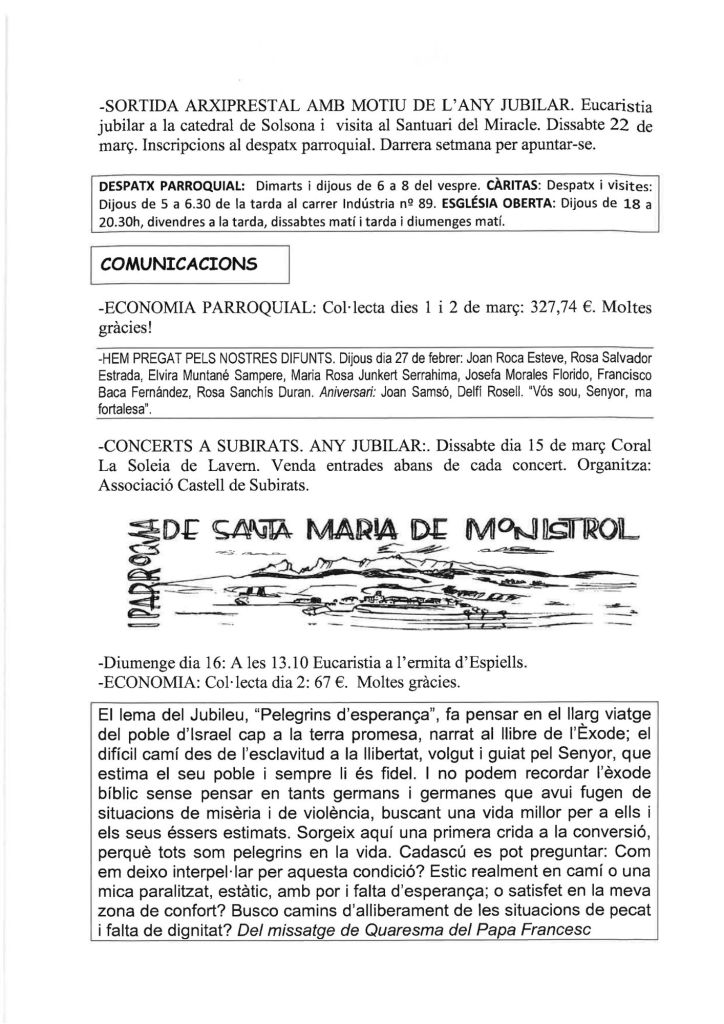 FRASE DEL DIUMENGE, PREGÀRIA I FULL DOMINICAL de Diumenge 2 de Març 2025