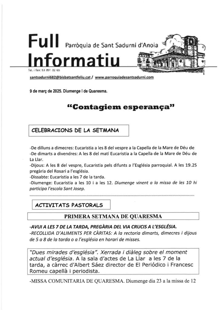 FRASE DEL DIUMENGE, PREGÀRIA I FULL DOMINICAL de Diumenge 9 de Març 2025