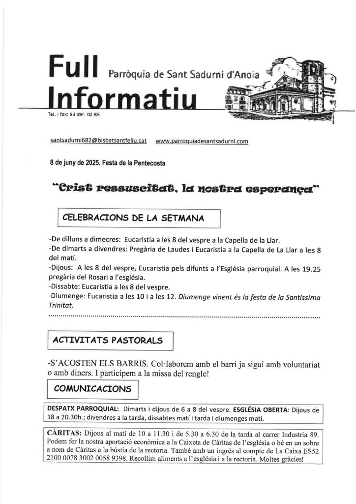 FRASE DEL DIUMENGE, PREGÀRIA I FULL DOMINICAL de Diumenge 8 de juny de 2025